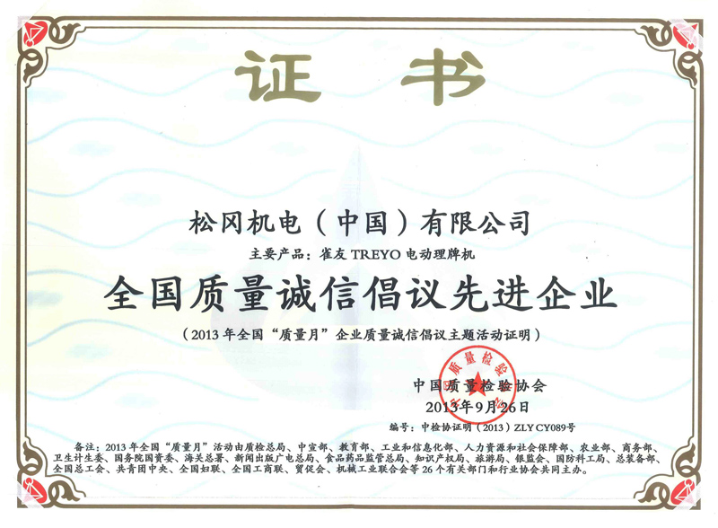 2013年9月,公司被评为全国质量诚信倡议先进企业。市长杯
