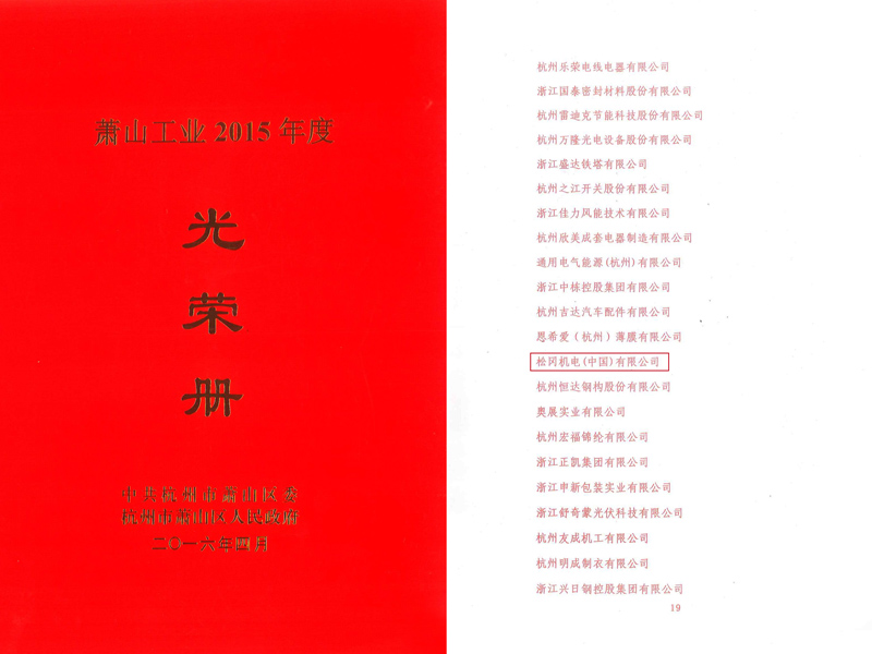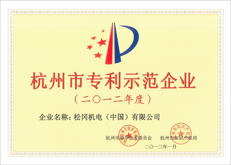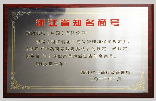 2012年4月,“松冈”获得“浙江省知名商号”荣誉称号。杭州市专利示范企业