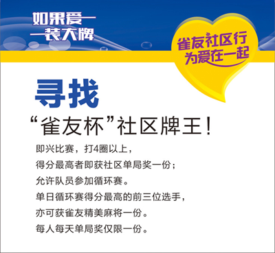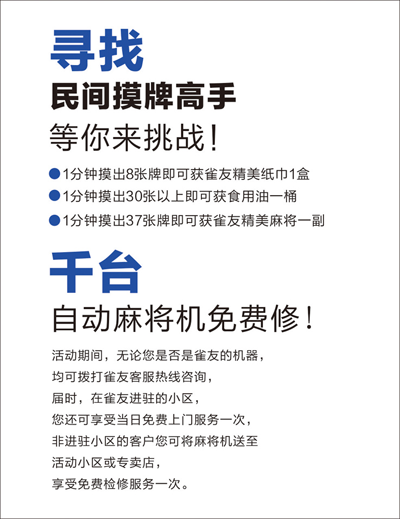 7月26日-8月31日期间,雀友将走到您身边,通过精心准备的"寻找社区麻将高手"、"寻找民间摸牌高手"、"千台麻将机免费修"等活动同你一起联欢。各地雀友经销商还都备下了实用礼品,等你共享快乐夏夜!